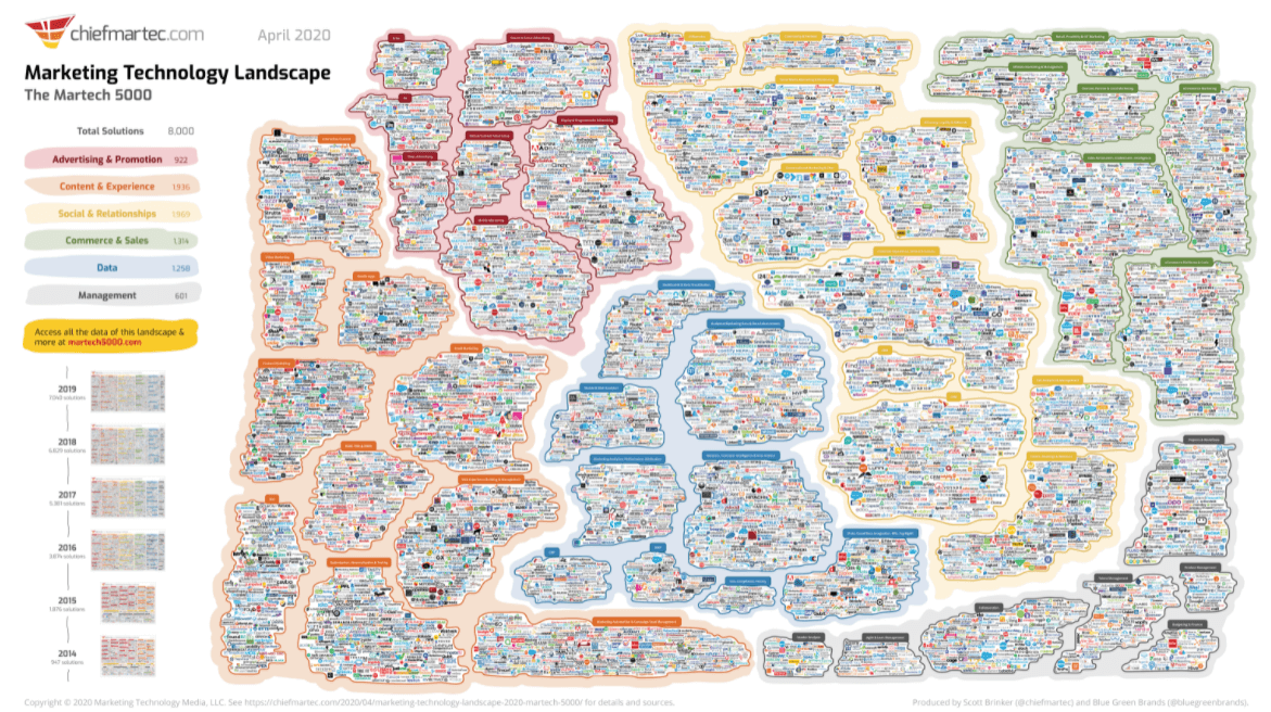 概要: 欢迎来到2020全球营销技术生态全景图。2020 MarTech解决方案相比2019年增长了13.6%,达到8,000个…